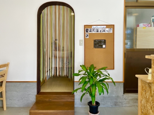 ゲストハウス前にあるカフェは、ランチタイムのみの営業で、ドリンクのほかパスタやどんぶりランチ、パンケーキが食べられます。