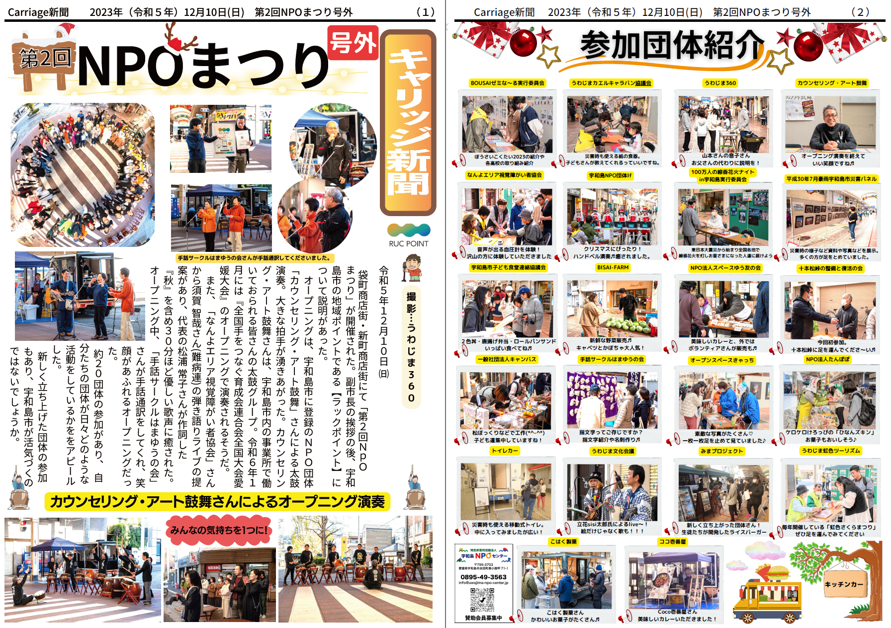 宇和島NPOセンターさんが発行されている機関誌「キャリッジ新聞」号外(2023年12月発行)のNPOまつりの記事に、うわじま360の写真を使用していただきました。